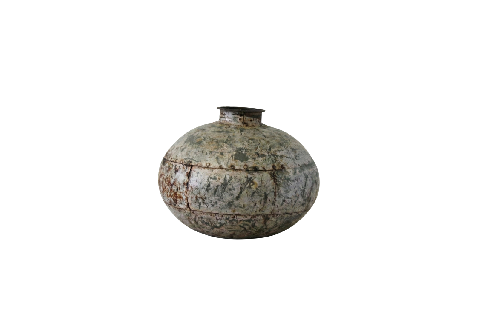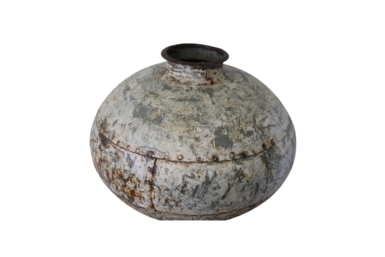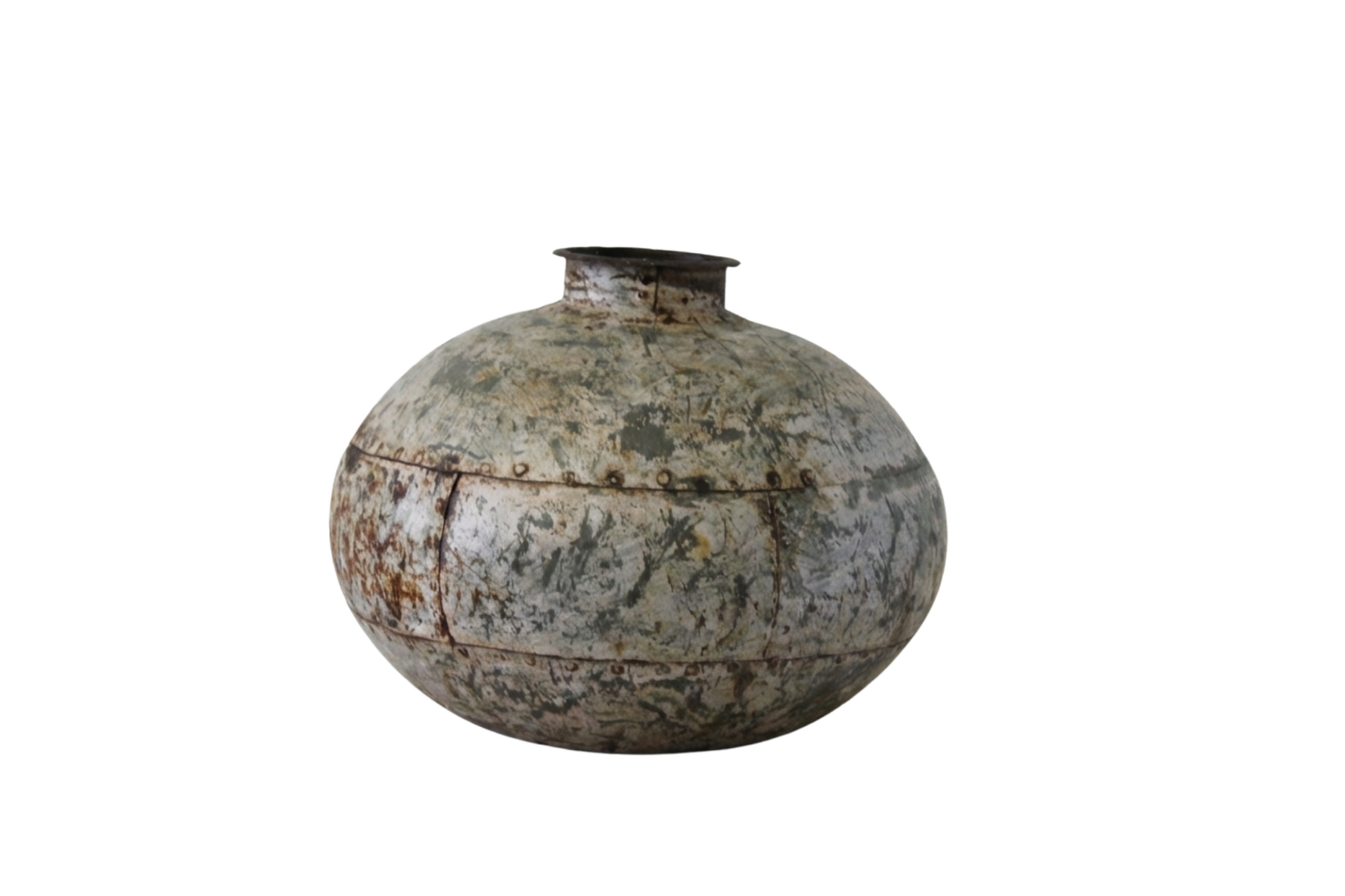 כד זה הוא יצירה המשלבת חספוס תעשייתי עם רכות ויזואלית. הוא עשוי מלוחות מתכת שחוברו במסמרות (Rivets) בולטות, ועבר תהליך יישון טבעי שהותיר עליו שכבה בהירה דמוית סיד או צבע לבן שהתקלף.